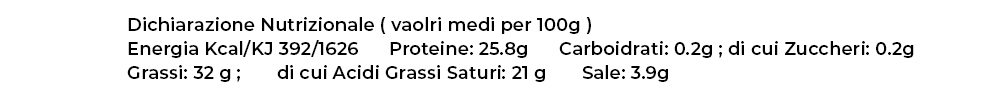 Dichiarazione Nutrizionale ( vaolri medi per 100g ) Energia Kcal/KJ 392/1626 Proteine: 25.8g Carboidrati: 0.2g ; di cui Zuccheri: 0.2g Grassi: 32 g ; di cui Acidi Grassi Saturi: 21 g Sale: 3.9g